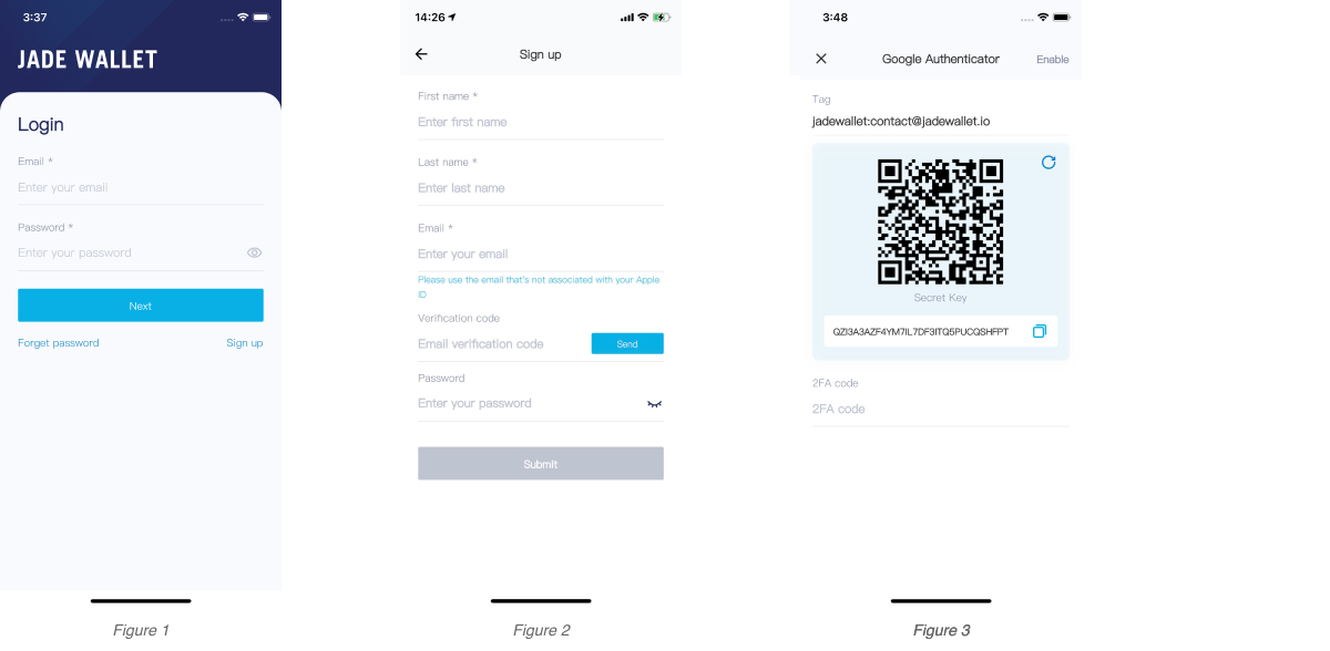 When you start using Jade Wallet for the first time, you will see the login page (Figure 1). If you haven't registered before, please click "Sign up" to fill out the registration information (Figure 2). You need fill the verification code sent to your email to verify and activate account.