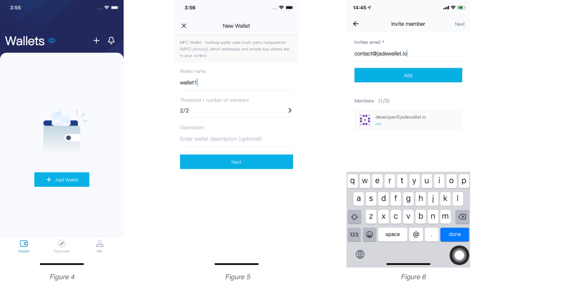 On “New Wallet" page (Figure 5), you should enter the wallet name, select the threshold and the number of members (currently 2/2, 2/3, 3/5). Jade Wallet uses multi-party computation technology to do threshold signature. The threshold is the number of members required to participate in multi-party calculations when signing transactionsq. After confirming that the information is correct, click "Next". Then you need to invite members to the wallet (Figure 6). After filling the email address of some member, click "Add" to invite him/her.