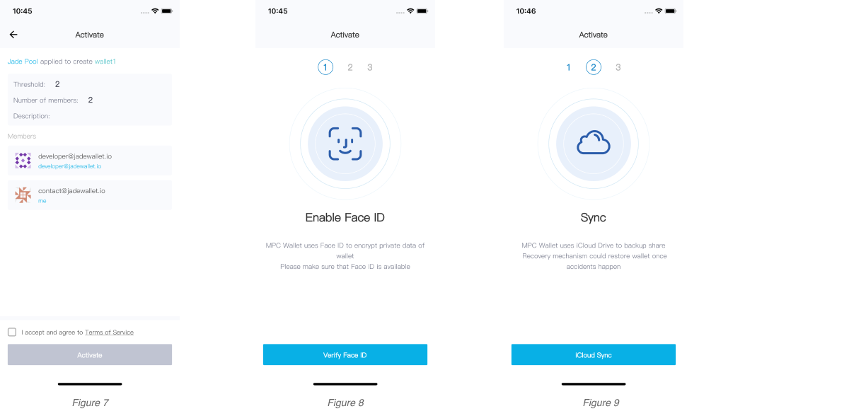 Click "Next" after members added. Then you should confirm the threshold, number of members and member information again, then check "Accept Terms of Service" and click "Activate" (Figure 7).