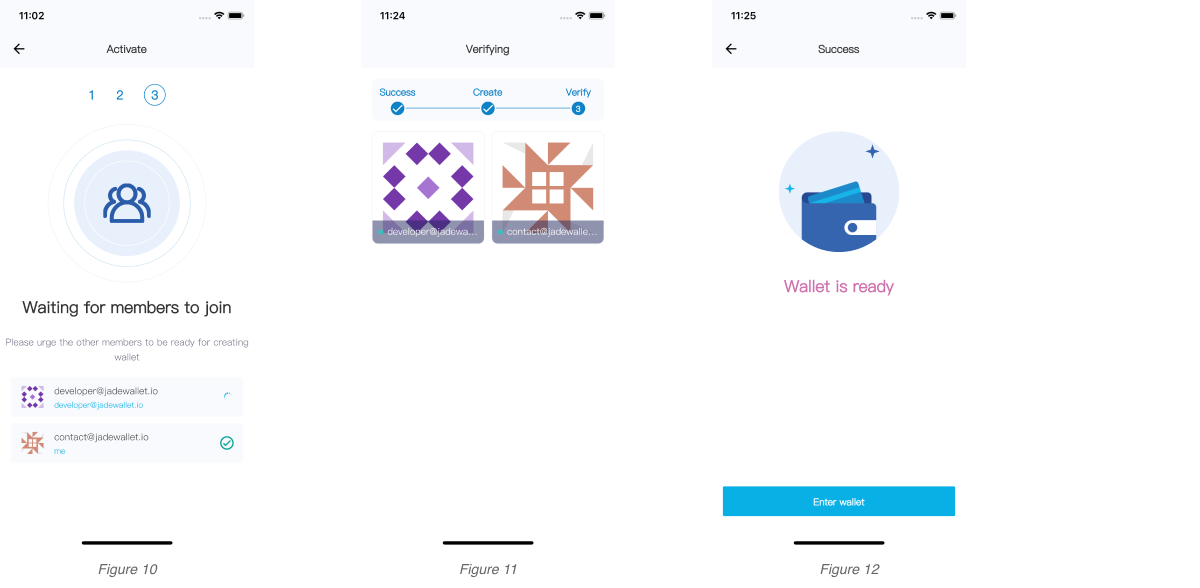 The last step to do before creating a wallet is to wait for other members to be ready (Figure 10). For the members who is ready, you will see the “ ✓ “ button on the right side of his account . After all members get in, it is time to start creating the wallet (Figure 11). Please pay attention to the prompt on the app when creating the wallet because Face ID verification is required. You will also see the message on the app to tell you that the wallet is successfully created (Figure 12).